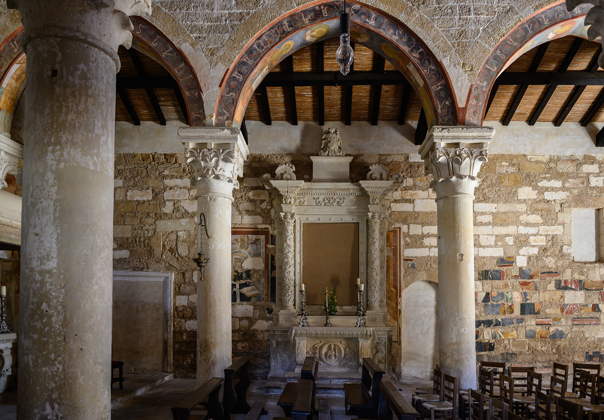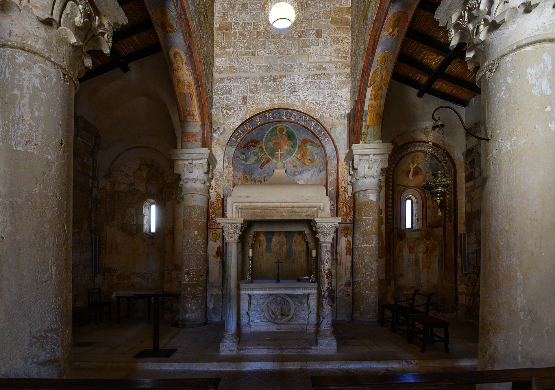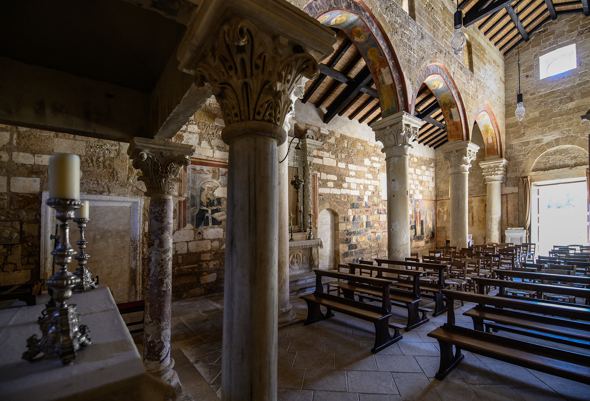 Costruita lungo l’antica via romana che collegava Brindisi, Lecce e Otranto, nel tempo l’abbazia si sviluppò fino a divenire uno dei più importanti complessi monastici dell’Italia meridionale. Nel 1531 passò sotto il controllo dell’Ospedale degli Incurabili di Napoli, che ne curò la manutenzione e ne sfruttò le rendite agricole. Dopo il saccheggio dei pirati turchi del 1711, il complesso fu abbandonato e si trasformò in una masseria dedita alla produzione dell’olio e alla lavorazione del tabacco. La chiesa di Santa Maria, con la sua facciata romanica a capanna, il rosone e il portale scolpito nella pietra leccese, custodisce un patrimonio unico di affreschi bizantini. Nel nel 2012 l’Abbazia venne affidata al FAI. Questo luogo è uno dei Beni che il FAI ha restaurato con cura e aperto al pubblico, perché tutti possano scoprirlo e amarlo. (Fonte: FAI)